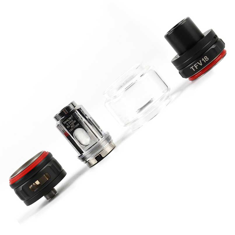 O tanque SMOK TFV18 apresenta maior capacidade de e-líquido de 7,5ml e estrutura de base criativa com cinco suportes.