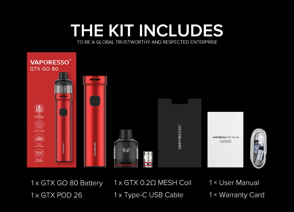 Vaporesso GTX Go 80 Uma atualização refrescante num vaporizador estilo caneta, o Vaporesso GTX GO possui GTX POD 26/22 magnético, permitindo que vaporizar com o estilo de um POD. O POD recentemente aprimorado apresenta um sistema Top-Filling, tornando o processo de recarga sem esforço e sem confusão. Completo com SSS Leak Resistant Technology, mantém o líquido no interior. GTX GO suporta toda a série de resistências GTX, incluindo uma opção em RBA. Emparelhado com um fluxo de ar facilmente ajustável e uma bateria embutida de 3000mAh e uma saída máxima de 80W com recursos de carga rápida TYPE-C 2A, GTX GO oferece uma experiência completa de vaporização.