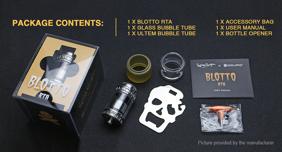 DOVPO Blotto RTA, projetado por Vaping Bogan e DOVPO, que possui sistema de fluxo de ar inferior ajustável e fluxo de ar de 242 ° para um sabor fantástico.